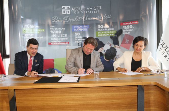 Abdullah Gül Üniversitesi (AGÜ), İl Göç İdaresi Müdürlüğü (GİM) ve Sığınmacılar ve Göçmenlerle Dayanışma Derneği (SGDD-ASAM) arasında iş birliği protokolü imzalandı.