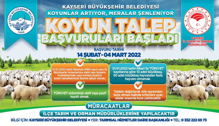 Kayseri Büyükşehir Belediye Başkanı Dr. Memduh Büyükkılıç’ın kırsal kalkınmaya destek olan ve 8 milyon 242 bin TL değerindeki ‘Koyunlar artıyor, meralar şenleniyor’ projesinin 3 bin 200 küçükbaş dağıtımını içeren ikinci kampanyasına başvurular başladı.