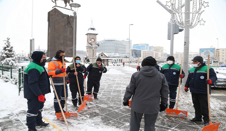 Cumhuriyet Meydanı’nda kaldırım ve yaya yolu karla mücadele çalışmalarını denetleyen Büyükşehir Belediye Başkanı Dr. Memduh Büyükkılıç, ekiplere kolaylıklar diledi.