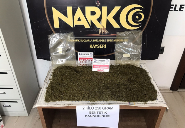 Kayseri'de yolcu otobüsündeki bebek çantasında 2 kilo 250 gram sentetik uyuşturucu bulundu, 5 şüpheli gözaltına alındı.