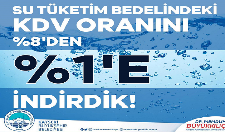 Kayseri Büyükşehir Belediye Başkanı Dr. Memduh Büyükkılıç, tüm abonelere yönelik su tüketim bedelindeki KDV oranının yüzde 1’e indirildiğini duyurdu.