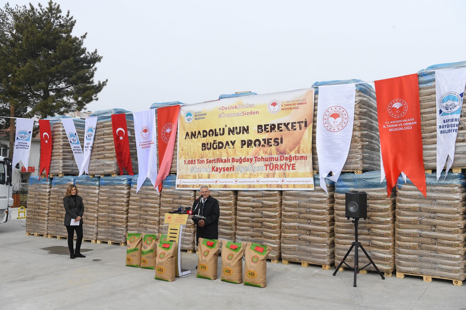 “Anadolu’nun Bereketi Buğday Projesi” kapsamında 12 ilçede uygulanacak olan ve yüzde 50’si Tarım ve Orman Bakanlığı, yüzde 25’i Kayseri Büyükşehir Belediyesi ve yüzde 25’i çiftçiler tarafından karşılanan 885 ton Ceyhan-99 çeşidi ve 200 ton Kayra çeşidi olmak üzere toplam 1085 ton yazlık ekmeklik buğday tohumluğu dağıtımı gerçekleştirildi.