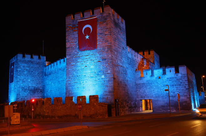 Türkiye’nin en büyük meydanlarından biri olan Kayseri Cumhuriyet Meydanı’nın simgelerinden tarihi Kayseri Kalesi, ay yıldızlı Türk bayrakları ile donatılmış duvarlarına yansıyan otizm farkındalık rengi olan mavi ışıkla ayrı bir güzelliğe büründü.