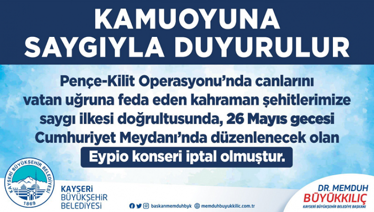 Şehit haberleri tüm Türkiye’ye yasa boğarken, Kayseri Büyükşehir Belediyesi, daha önce kamuoyuna duyurduğu Cumhuriyet Meydanı’nda 26 Mayıs’ta gerçekleşecek olan Eypio konserinin iptal edildiğini duyurdu.