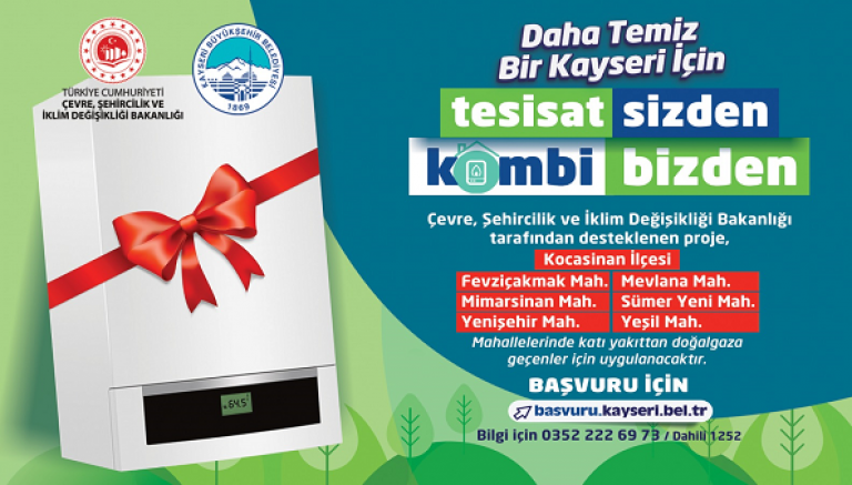 Kayseri Büyükşehir Belediyesi, kent genelinde hava kalitesini arttırmayı hedefleyen çevreci kampanyası 'Tesisat Sizden, Kombi Bizden' projesinin ikinci etabı için başvuruları almaya devam ediyor.