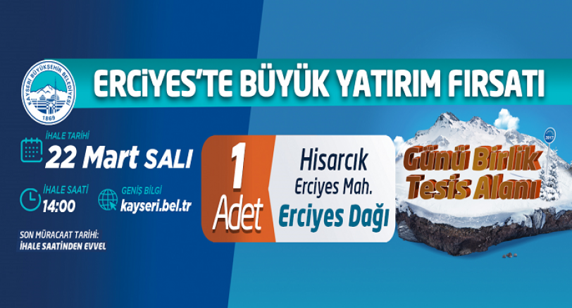 Kayseri Büyükşehir Belediyesi tarafından Melikgazi ilçesi, Hisarcık-Erciyes Mahallesi’nde bulunan Günü Birlik Tesis Alanı “Kapalı Teklif Usulü” ihale ile satışa çıkarılacak.