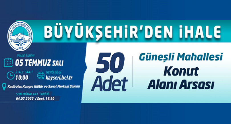 Kayseri Büyükşehir Belediyesi tarafından Kocasinan İlçesi, Güneşli Mahallesi’nde bulunan 50 adet Konut Alanı Arsası “Açık Teklif Usulü” ihale ile ayrı ayrı satışa çıkarılacak. İhale, 5 Temmuz Salı günü saat 10.00’da Büyükşehir Belediyesi Kadir Has Kongre Kültür ve Sanat Merkezi Salonu’nda gerçekleştirilecek.