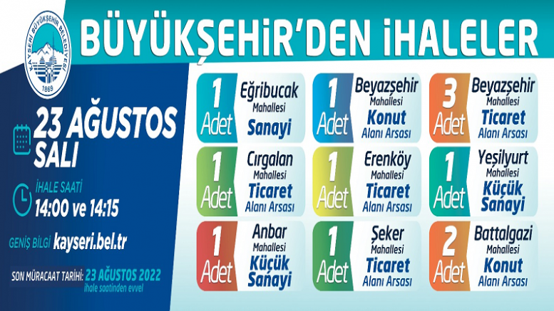 Kayseri Büyükşehir Belediyesi tarafından şehrin muhtelif yerlerinde bulunan toplam 12 adet arsa hem “Açık Teklif Usulü” hem de “Kapalı Teklif Usulü” ihale ile ayrı ayrı satışa çıkarılacak.