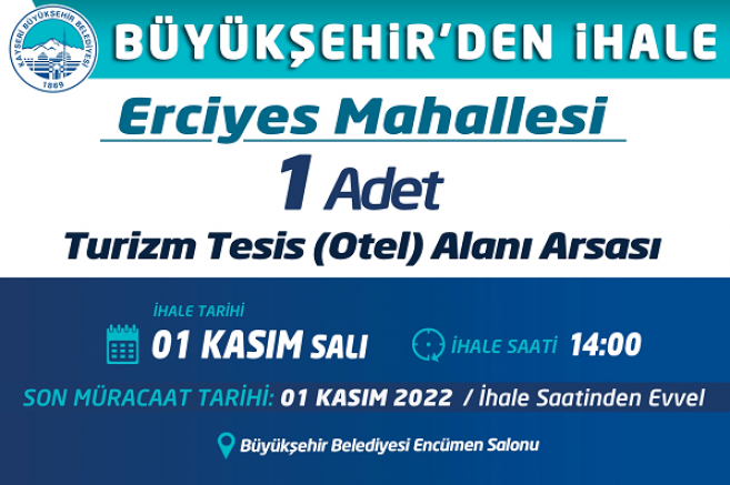 Kayseri Büyükşehir Belediyesi tarafından Melikgazi ilçesi, Erciyes Mahallesinde bulunan turizm tesis alanı (otel) arsası “Kapalı Teklif Usulü” ihale ile satışa çıkarılacak.