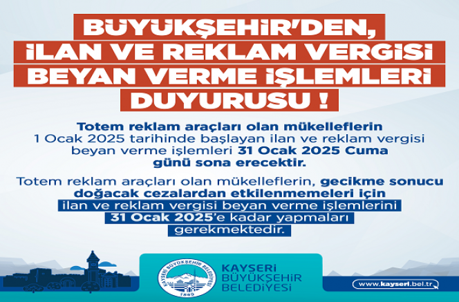 Kayseri Büyükşehir Belediyesi Mali Hizmetler Daire Başkanlığı, totem reklam araçları olan mükelleflerin ilan ve reklam vergisi beyan verme işlemlerini 31 Ocak 2025 tarihine kadar yapabileceklerini duyurdu.