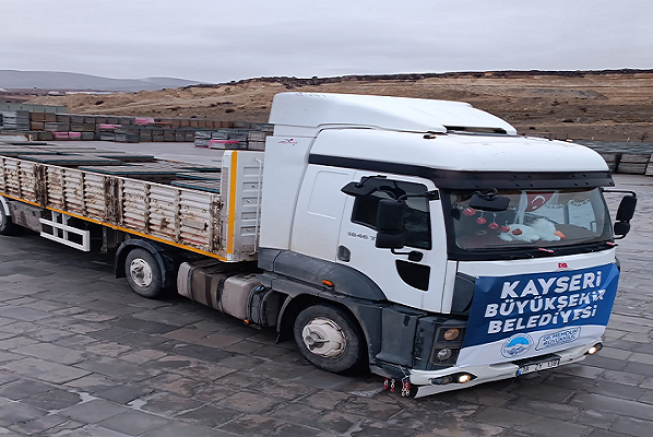 Kayseri Büyükşehir Belediyesi, Başkan Dr. Memduh Büyükkılıç’ın talimatlarıyla deprem bölgesi Malatya’da konteyner kent çalışmalarında kullanılmak üzere Darende Belediyesi'ne 3 bin metrekare kilitli parke gönderdi.