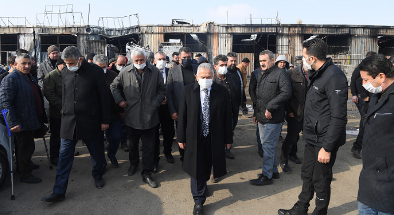 Kayseri Büyükşehir Belediye Başkanı Memduh Büyükkılıç, çıkan yangında 10 dükkan ve 3 tırın kullanılamaz hale geldiği Nakliyeciler Sitesi'nde incelemelerde bulundu.