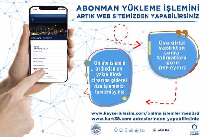 Abonman yükleme işlemi online olarak, http://kart38.com yada http://kayseriulasim.com adreslerinden yapılabilirken, yükleme işleminin ardından en yakın kiosk cihazlarından vize işlemi tamamlanabilecek.