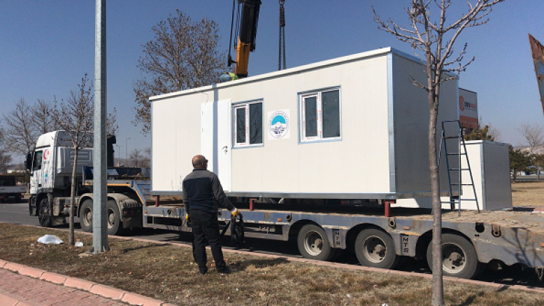 Kayseri Büyükşehir Belediyesi, depremden etkilenen Sarız ilçesinde ihtiyaç duyulan içerisinde duş ve mutfağı bulunan 2 odalı 5 adet konteyneri bölgeye gönderdi.