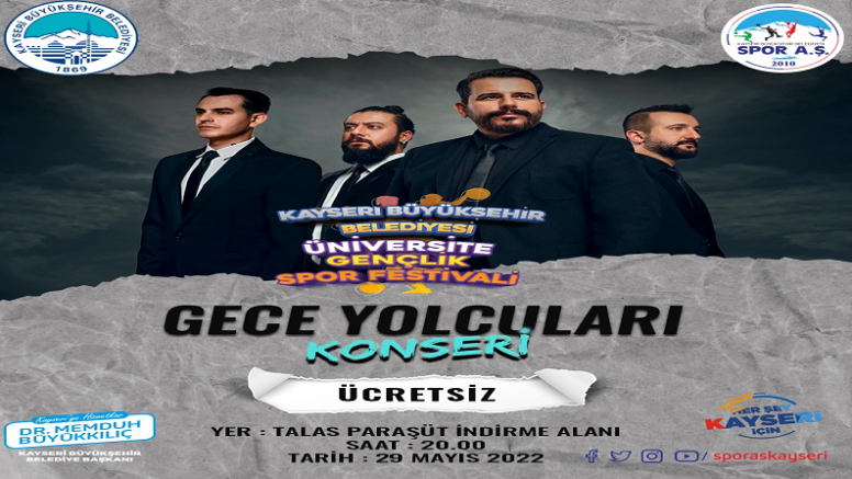 Kayseri Büyükşehir Belediyesi, gençlere yönelik etkinlikler kapsamında Üniversite Gençlik Spor Festivali düzenliyor. Spor A.Ş. tarafından 21-28 Mayıs tarihleri arasında gerçekleşecek festivale kayıtlar başlarken, festivalin sonunda düzenlenecek ödül töreninde sevilen müzik grubu Gece Yolcuları sahne alacak.