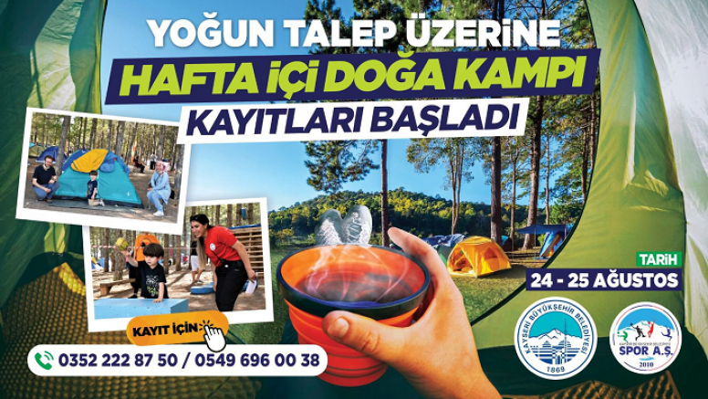 Kayseri Büyükşehir Belediyesi Spor A.Ş.’nin geleneksel olarak sürdürdüğü, hafta sonlarında vatandaşların doğa ile iç içe zaman geçirdiği doğa kampları, yoğun ilgi ve talep üzerine hafta içi de düzenlenecek. Kayserililerden büyük beğeni toplayan doğa kamplarının hafta içi programları için kayıtlar başladı.
