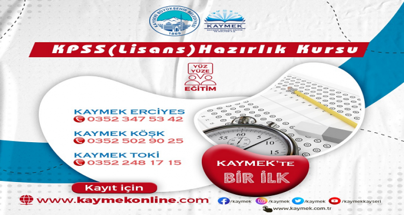 www.kaymekonline.com internet adresi üzerinden kayıtları alınmaya başlanan KPSS kursu, KAYMEK Erciyes, KAYMEK Köşk ve KAYMEK TOKİ Tesisleri’nde ücretsiz şekilde yüz yüze eğitim şeklinde planlandı.