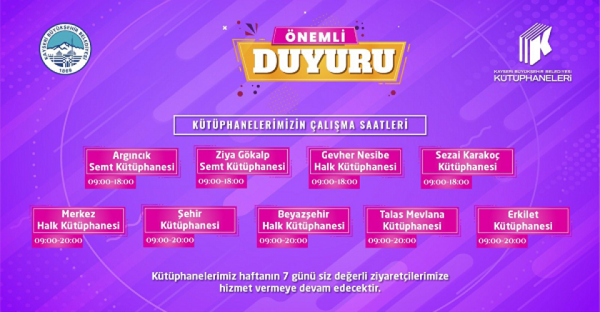 Yapılan değişikliğe göre Argıncık Semt Kütüphanesi 09.00-18.00, Ziya Gökalp Semt Kütüphanesi 09.00-18.00, Gevher Nesibe Halk Kütüphanesi 09.00-18.00, Sezai Karakoç Kütüphanesi 09.00-18.00 saatleri arasında hizmet verecek. Ayrıca Merkez Halk Kütüphanesi 09.00-20.00, Şehir Kütüphanesi 09.00-20.00, Beyazşehir Halk Kütüphanesi 09.00-20.00, Talas Mevlana Kütüphanesi 09.00-20.00 ve Erkilet Kütüphanesi de 09.00-20.00 saatlerinde kitap kurtlarına hizmet verecek.