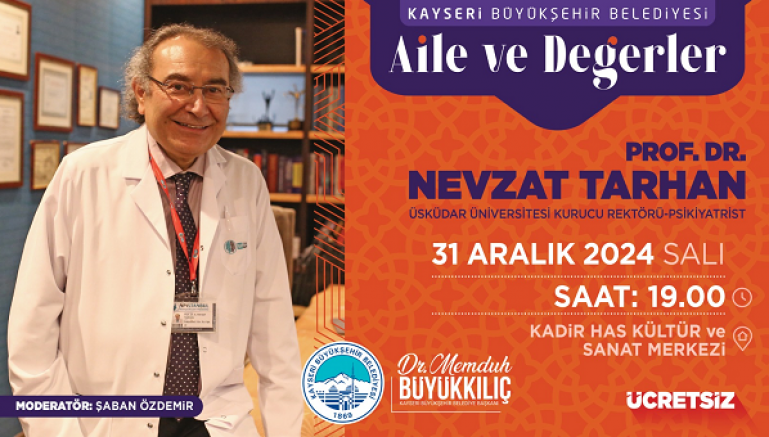 Kayseri Büyükşehir Belediyesi toplumun her kesimine hizmet götürmeye devam ederken, bu kapsamda uzmanlığı ve kişiliği ile sevilen Psikiyatrist Prof. Dr. Nevzat Tarhan’ı konuk ederek ‘Aile ve Değerler’ konferansı gerçekleştiriyor.