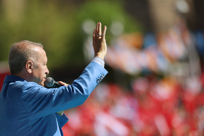 Erdoğan, kürsüye eşi Emine Erdoğan ile çıktı ve seçim şarkılarına eşlik etti.
