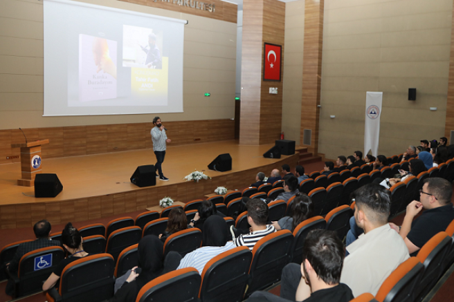 Rektör Prof. Dr. Altun’un konuşmasının ardından konferansın konuşmacısı Eğitimci Yazar Tahir Fatih Andı, “Kanka Buradayım” adlı kitabında yer alan yaşam hikâyelerinden bahsetti.