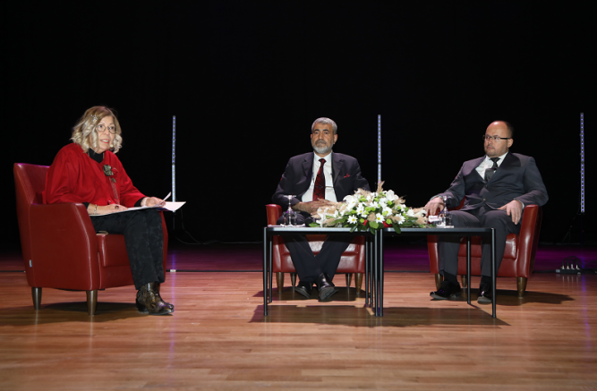 Etkinlikte Güzel Sanatlar Fakültesi Dekanı Prof. Dr. Aygül Aykut’un moderatörlüğünde Genel Sekreter Yardımcısı Prof. Dr. Mehmet Kasım Özgen ve Eskişehir Osman Gazi Üniversitesi Öğretim Üyesi Abullatif Tüzer’in konuşmacı olarak katıldığı söyleşi gerçekleştirildi.