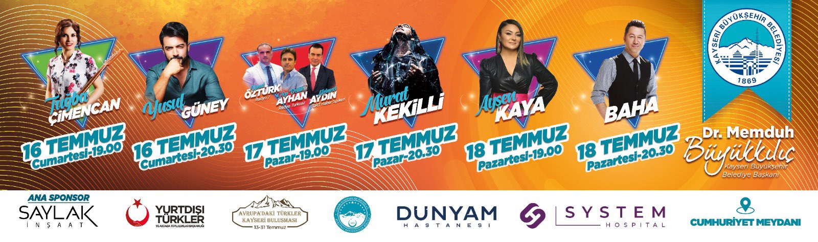 Büyükşehir Belediyesi, Başkan Dr. Memduh Büyükkılıç’ın talimatlarıyla, 13-31 Temmuz Avrupa’daki Türkler Kayseri Buluşması kapsamında Türkiye’nin en büyük meydanlarından biri olan Cumhuriyet Meydanı’nda ünlü sanatçıların sahne alacağı, 13 Temmuz Çarşamba günü başlayacak, konserlerle Kayserililere müzik ziyafeti yaşatacak.