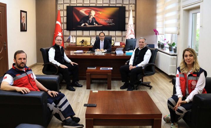 Hava Ambulansı Kaptan Pilotları Nafiz Çavuşoğlu ve Mustafa Hırçın, sağlık ekibinde görevli Dr. Onur Ünal ve Paramedik Kübranur Dabanlı ile İl Sağlık Müdürü Mehmet Erşan'ı ziyaret etti.