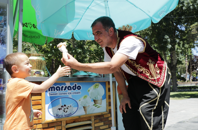 Demirbanka, Cumhuriyet Meydanı'nda kendisine uygun görülen alanda açtığı tezgahta, yemenisi ve yöresel kıyafetiyle dondurma satıyor.