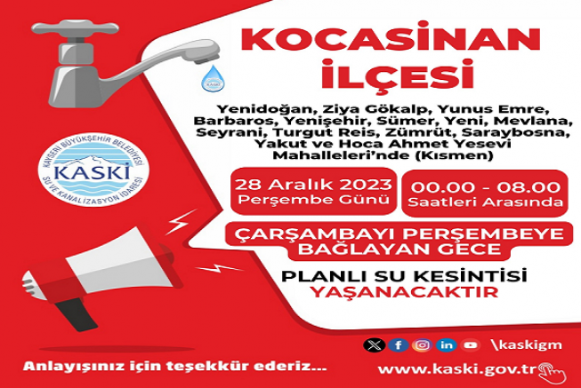 "Abonelerimize sağlıklı, kaliteli ve yeterli miktarda içme suyu iletimi sağlamak adına Kocasinan ilçesinde Yenidoğan, Ziya Gökalp, Yunus Emre, Barbaros, Yenişehir, Sümer, Yeni, Mevlana, Seyrani, Turgut Reis, Zümrüt, Saraybosna, Yakut ve Hoca Ahmet Yesevi mahallelerinde içme suyu bağlantı çalışması nedeniyle 28.12.2023 tarihinde 00.00 ile 08.00 saatleri arasında planlı su kesintisi uygulanacak."