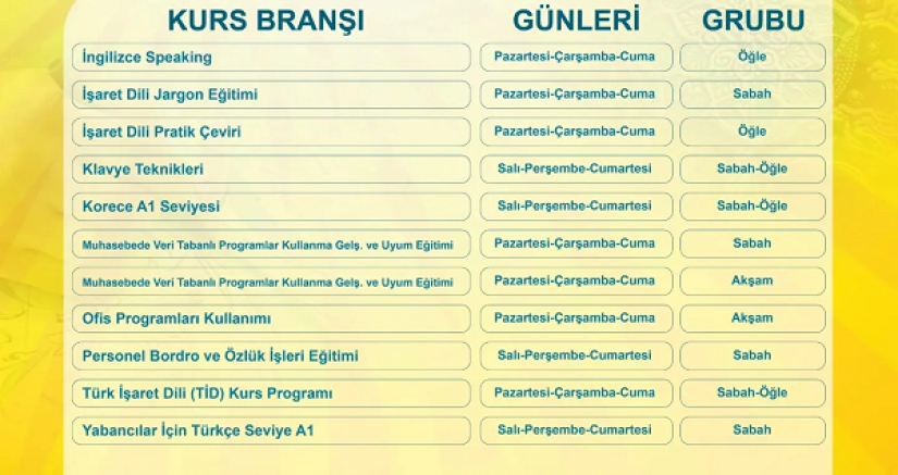 KAYMEK Sanat ve Mesleki Eğitim Yaz Dönemi Kursları içerisinde; ‘Almanca A1 10-14 yaş, Almanca A1 yetişkin, çocuklar için örgü (parmak örgüsü), çocuklar için resim sanat eğitimi, dekoratif ahşap süsleme, dekoratif sepet örücülüğü, drapaj tekniği ile kadın bluz dikimi, ebru 10-14 yaş, etkili ve hızlı okuma, hüsnü hat, ileri excel geliştirme ve uyum eğitimi, İngilizce A1, İngilizce A1 10-14 yaş, meddata hastane otomasyon sistemi destekli tıbbi sekreterlik, nevresim takımları dikimi, ofis programları kullanımı, punch nakışı ile çanta yapımı, seramik hamuru ile dekoratif çiçek yapımı, şiş ve tığ örücülüğü ile oyuncak bebek yapımı (amigurumi),temel bilgisayar eğitimi 10-13 yaş, misinalı takı yapımı, muhasebe veri tabanlı programlar kullanma, geliştirme ve uyum eğitimi, ofis programları kullanımı, overlok makineci (mobilya terziliği), Rusça başlangıç seviyesi, Türk işaret dili kurs programı, İngilizce speaking, işaret dili jargon eğitimi, işaret dili pratik çeviri, klavye teknikleri, Korece A1, personel bordro ve özlük işleri eğitimi, yabancılar için Türkçe A1, diksiyon 11-14 yaş, etkili ve hızlı okuma 8-13 yaş, Kur’an-ı Kerim eğitimi, İngilizce hazırlık, Almanca başlangıç seviyesi, CorelDraw, çini sanat eğitimi, dekoratif örtü dikimi, iğne oyası yapımı, kadın düz dar etek dikimi’ gibi onlarca farklı kurs yer alıyor.