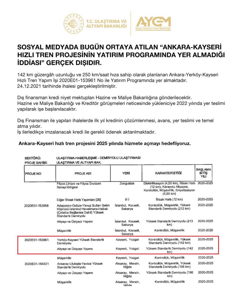 Ulaştırma ve Altyapı Bakanlığı Altyapı Yatırımları Genel Müdürlüğünün sosyal medya hesabından yapılan açıklamada da "Sosyal medyada bugün ortaya atılan Ankara-Kayseri Hızlı Tren projesinin yatırım programında yer almadığı iddiası gerçek dışıdır." ifadesine yer verildi.