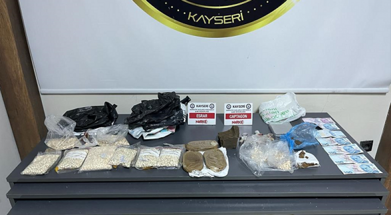 Kayseri'de düzenlenen operasyonda 1 kilo 328 gram esrar ve 9 bin 409 uyuşturucu hap ele geçirildi, 2 zanlı gözaltına alındı.
