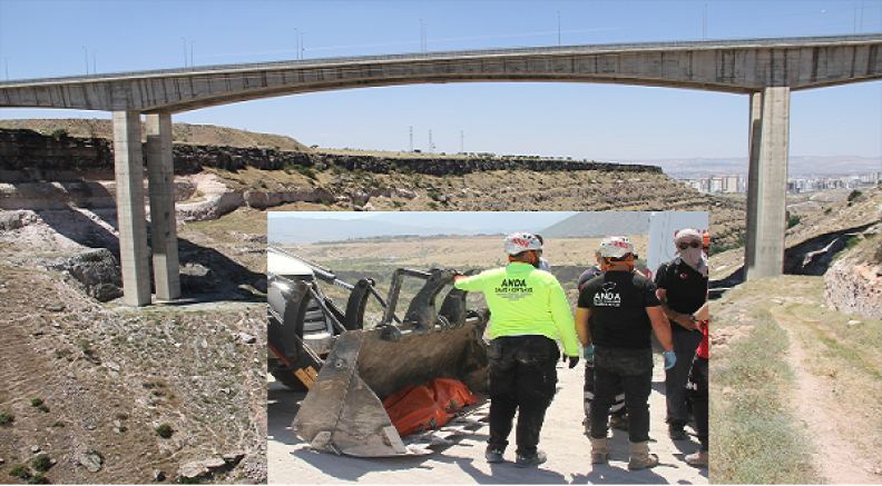 Olay yeri inceleme ekiplerinin çalışmasının ardından sedyeyle ile alınan cenaze, iş makinesinin kepçesinde viyadük yoluna çıkarıldı.