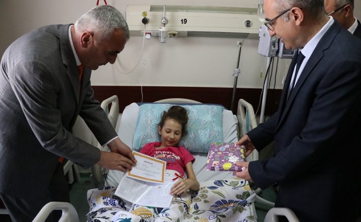 İl Milli Eğitim Müdürü Ayhan Teltik, İkranur'u hastanede ziyaret ederek karnesini verdi.