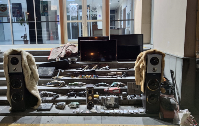 Evdeki aramada çalıntı olduğu değerlendirilen 5 tabanca, 3 tüfek, 86 fişek, 2 kürk ve 5 televizyon ile 3 gram esrar, 4 gram sentetik uyuşturucu, uyuşturucu içiminde kullanılan aparat, pitbull cinsi köpek ve çok sayıda inşaat malzemesi ele geçirildi.