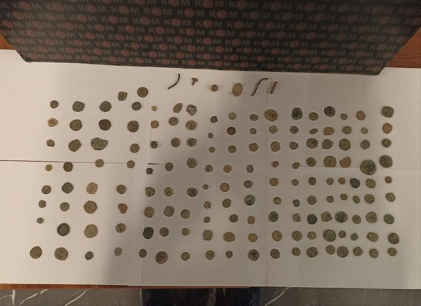 Şüphelinin üzerinde yapılan aramada, poşet içerisinde saklanan 200 sikke ve obje ele geçirildi.