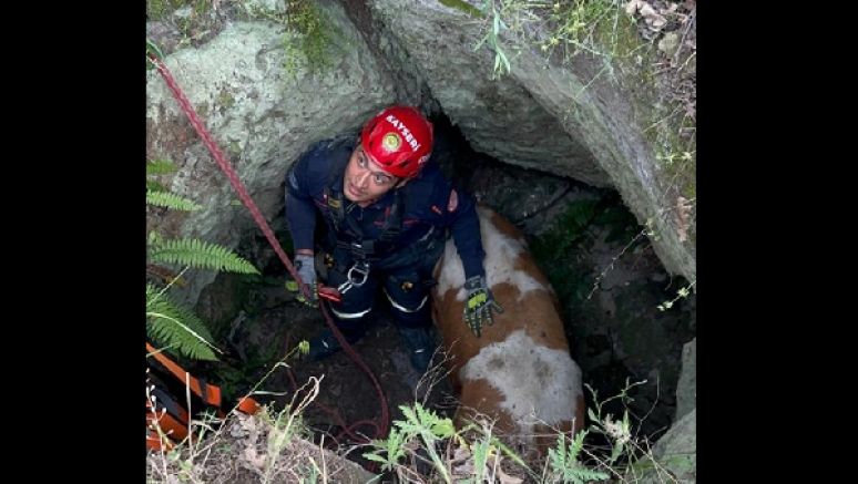 Kayseri'nin Talas ilçesinde kuyuya düşen büyükbaş hayvanı, itfaiye ekipleri kurtardı.