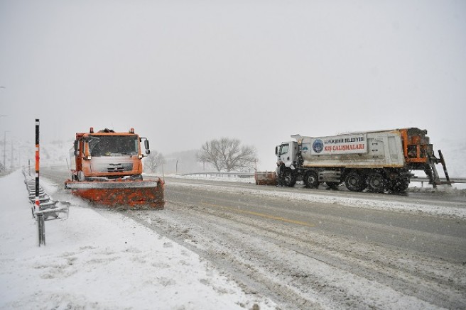 Kayseri'de etkisini artıran kar yağışı ve tipi nedeniyle kent merkezi ve kırsalda ulaşımın aksamaması için tüm birimler seferber oldu.