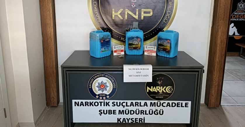 Kayseri'de düzenlenen operasyonda 34 kilo 150 gram sıvı sentetik uyuşturucu bulundu, 3 zanlı gözaltına alındı.