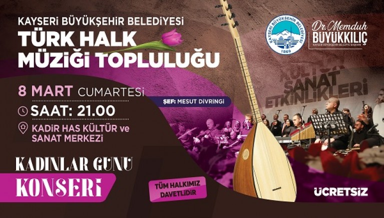 Kayseri Büyükşehir Belediyesi Türk Halk Müziği Topluluğu 8 Mart Dünya Kadınlar Günü dolayısıyla konser düzenliyor. Büyükşehir Belediyesi, 8 Mart Cumartesi günü Kadir Has Kültür ve Sanat Merkezi’nde saat 21.00’de gerçekleştireceği Kadınlar Günü Konseri ile ücretsiz bir şekilde Kayserililere müzik ziyafeti sunacak.