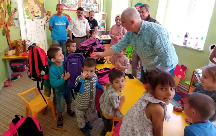 Bu kapsamda düzenlenen törende öğrencilere okul çantası, defter ve boyama kalemi dağıtıldı.
