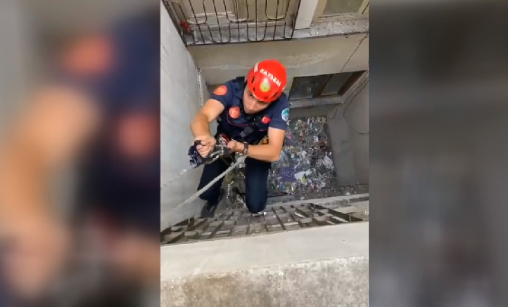 Apartmana gelen itfaiye personeli iple sarkarak, kediyi mahsur kaldığı havalandırma boşluğundan çıkarıp, sahibine teslim etti.