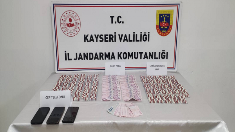 Kayseri'de jandarma ekipleri tarafından yapılan çalışmalarda 1036 adet LYRİCA sentetik hap, suçtan elde edilen 9200 TL para ve 3 adet cep telefonu ele geçirildi.