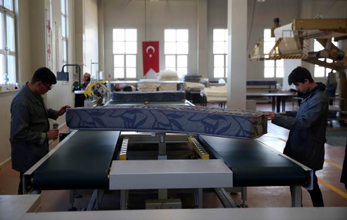 Kayseri'deki Türkiye Tekstil Sanayi İşverenleri Sendikası Mesleki ve Teknik Anadolu Lisesinde deprem bölgeleri için yatak üretimi yapılıyor.
