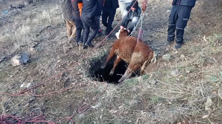 Kayseri'nin Melikgazi ilçesinde 3 metrelik boş su kuyusuna düşen dana, itfaiye ekiplerince kurtarıldı.