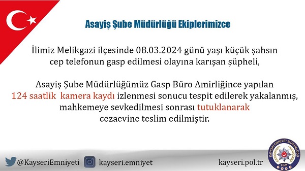 Kayseri İl Emniyet Müdürlüğü Asayiş Şube Müdürlüğü'ne bağlı Gasp Büro Amirliği ekiplerince yapılan çalışmalarda Melikgazi ilçesinde bir çocuğun cep telefonunun gasp eden kişi 124 saatlik kamera kaydı izlenmesi sonucu tespit edilerek yakalandı. Adliyeye sevk edilen kişi, çıkarıldığı hakimlikçe tutuklandı.
