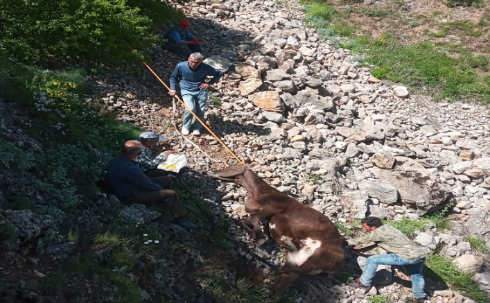 Kayseri'de dere yatağına düşen inek, itfaiye ve jandarma ekiplerince kurtarıldı.