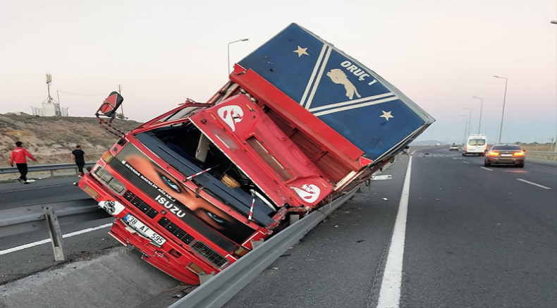 İ.O. yönetimindeki 38 AT 595 plakalı kamyon, Kuzey Çevre Yolu'nda bariyere çarpıp devrildi.