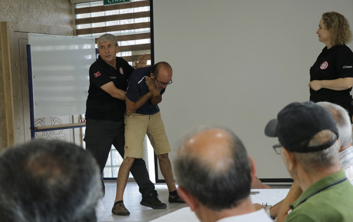 Hava yolu tıkanıklığıyla ilgili sunum yapan eğitimciler, uygulamalı olarak Heimlich manevrasını maketler üzerinde gösterdi, daha sonra emekli öğretmenler de kendi aralarında manevrayı uyguladı.